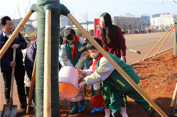 振翩學(xué)校學(xué)生代表在老師的帶領(lǐng)下為剛栽好的樟樹(shù)澆水