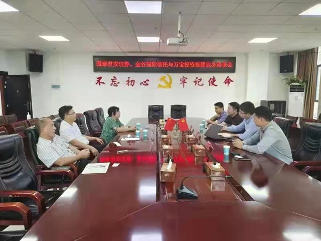 9月29日,國泰君安證券股份有限公司債務(wù)融資部業(yè)務(wù)董事陳洋、機構(gòu)客戶部執(zhí)行董事王晟,金谷國際信托公司廣東業(yè)務(wù)部執(zhí)行總經(jīng)理袁東陽一行,來萬寶投資集團開展融資業(yè)務(wù)洽談。萬寶投資集團董事長梁養(yǎng)賢率財務(wù)融資部負責人進行接洽并組織召開座談會。